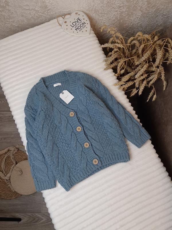 Теплый вязаный кардиган на пуговицах от Next 🔸️Бирка: 4 года (104) ▪️Состояние: новый с биркой. 🔸️Замеры: длин 43, шир 33, рукав от горловины 45 см. Цена 265 грн. Смотрите также другие Мои объявления