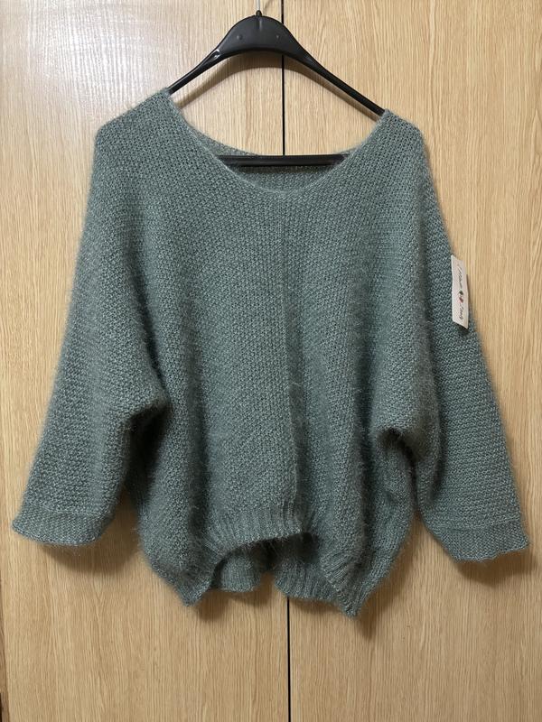Фасон: оверсайз на обьем ОГ 90-115см Перед 64см, зад 68, Рукав 3/4 Цвет: нежный, мягко-оливковый (холодный подтон) Производство Италия. Вырез позволяет носить как на спущенном плече, так и лодочкой, и веобразно. Теплая, мягкая, не колется. Новая с биркой.