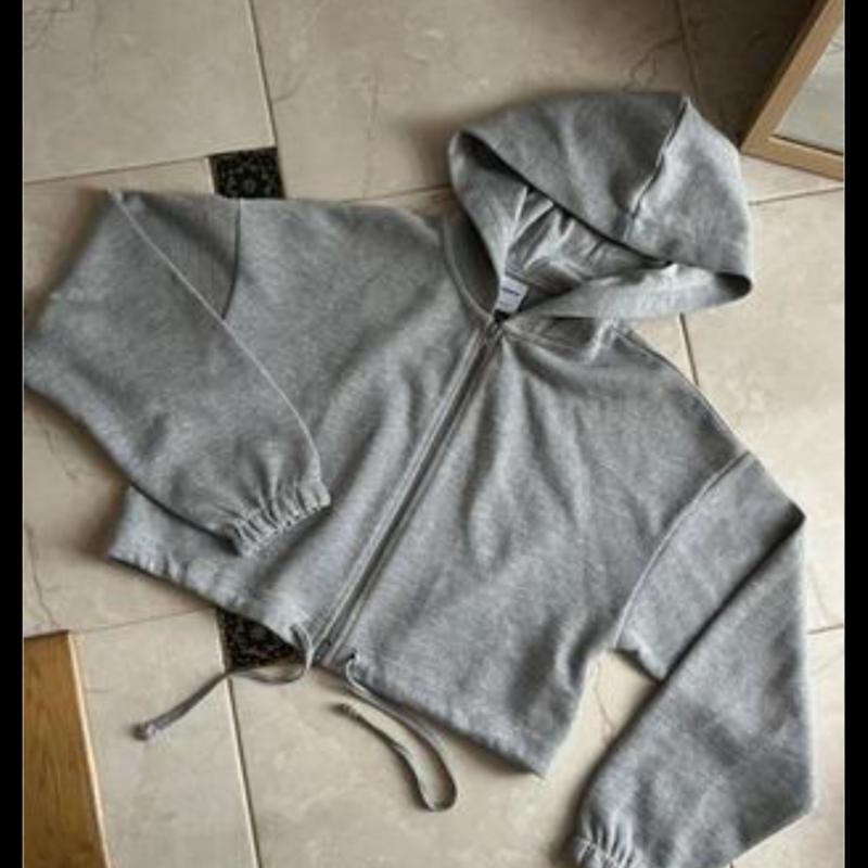 серая кофта с капюшоном на застежку, укороченная назад смотрится очень стильно, спортивный стиль, размер М