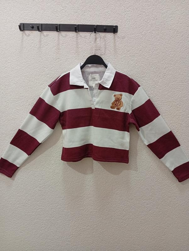 Рубашка-поло или свитер-поло в стиле регби. Вышивка плюшевого мишки на груди и белый воротничок