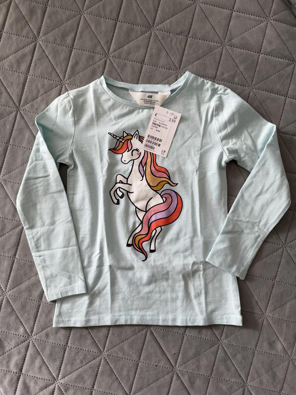 Фирменная кофточка для девочки с модным принтом-единорог, размер указан 4-6 лет на рост 110-116 см.