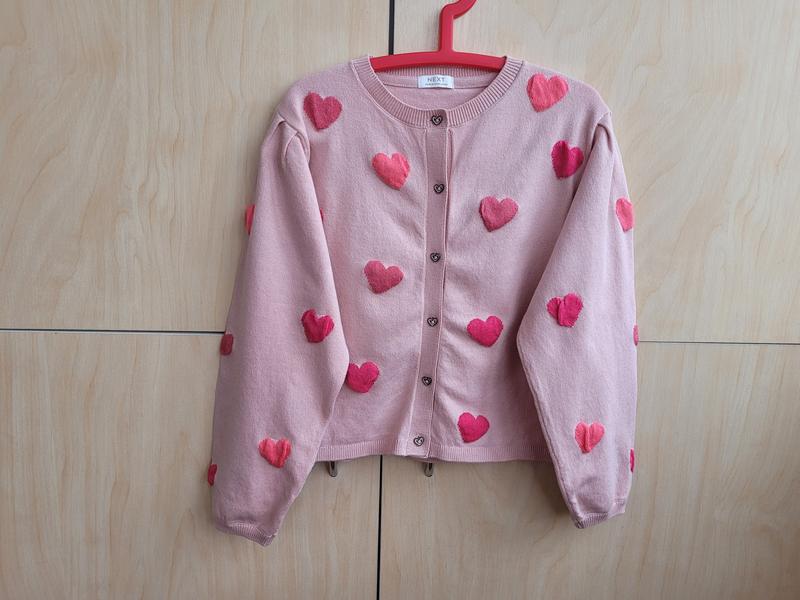 Кофта в сердечки next на 5-6 лет 80% котон 17% нейлон 3% еластан Пог 37. Рукав от плеча 40,5. Длина 40. Состояние отлично