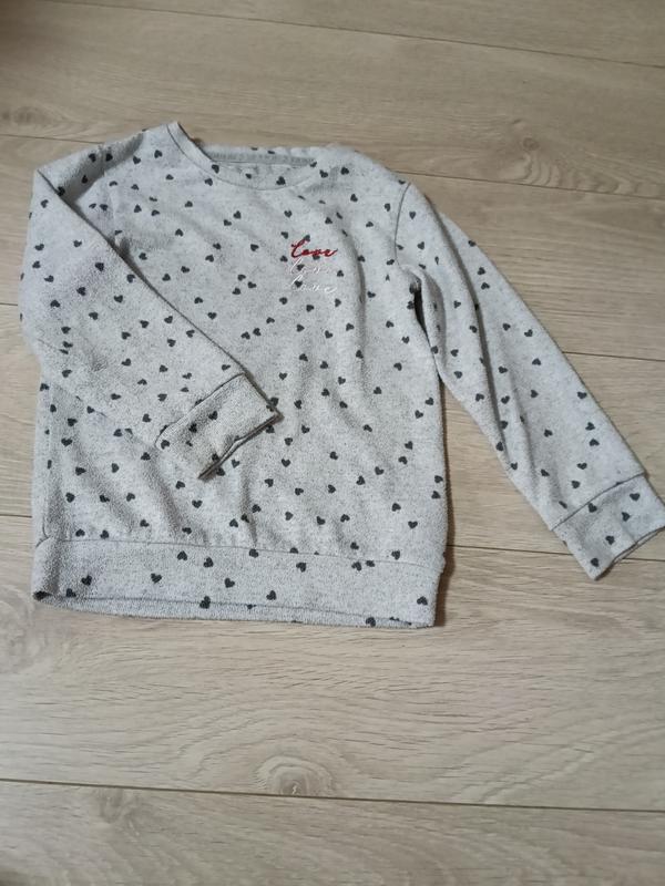 Кофта на девочку.Замеры на фото.Легка и удобная.Цвет серый.Принт в черные сердечки.Аик 3-4 рочки Рост 98-104 см.