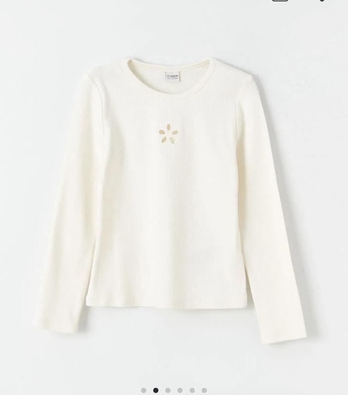 Білий лонгслів у рубчик від бренду C&A,прикрашений невеликою квітковою вирізкою посередині грудей. Тканина з фактурою "рубчик" ,що добре тягнеться. 15
