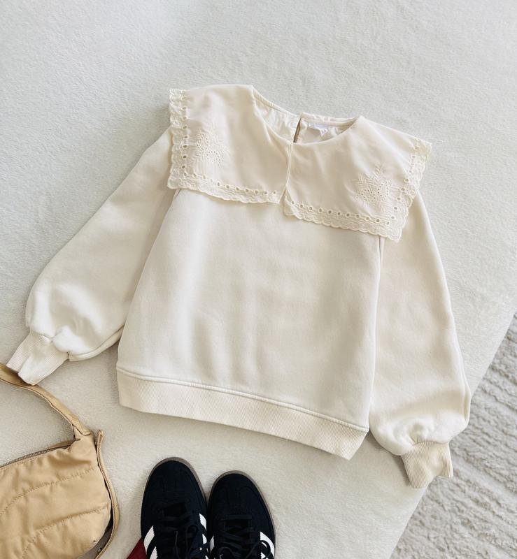 Кофта з красивим комірцем Молочного кольору Розмір 13-14 р на зріст 164 см 65% котон, 35% полістер По грудей 46 см Рукав 62-53 см Довжина 51 см