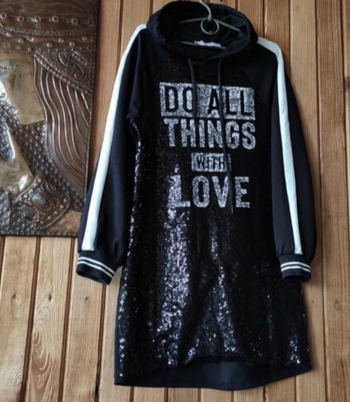 В НАЯВНОСТІ👖🧥👗👕🥼👙🩲👜 біжутерія, коригуюча та ниж.білиз.; дит.шк.одяг, термо куртки, шапки... зріст 📌MARIONS📌 Турція 134 котон 95% 5% еластан Артикул 7001 Спортивна туніка неодмінно прийдеться до смаку навіть дуже вимогливій модниці. Дуже гарно лягає по фігурі. Модель з довгими рукавами реглан, на манжетах, круглий виріз горловини,з капюшо -ном,на ліцевій стороні прикраше -на оригінальним орнаментом принтом-написом.Сшита з натур. тканина+еластану, що забезпечує добру зносостійкість, перешкод- жає його деформації після прання і сприяє збереженню кольору. Спереду тканина у пайетках,ззаду гладка.Виглядає ошатно і стильно. 👇 Обов'язково ДО покупки звірте виміри: - Довжина перед/зад 72/76 см - ПОГ 38 см - Рукав реглан 60 см - Бічний шов 50 см 🙂 З нетерпінням чекаю у мене на сторінці. Бажаю вдалих покупок і супер настрою від них.