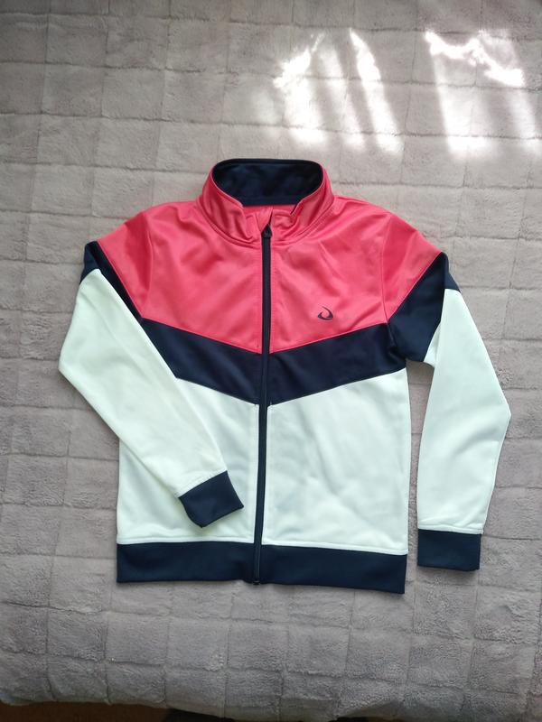 Красивая спортивная кофточка TEX на девочку 7-10 лет. В отличнейшем состоянии. Ткань полиэстер. Хороший пошив делает её удобной и красиво смотрится когда одета. Замеры: плечи 32 см., пог. 37 см., длина рукава 48 см., длина по спинке 48 см.