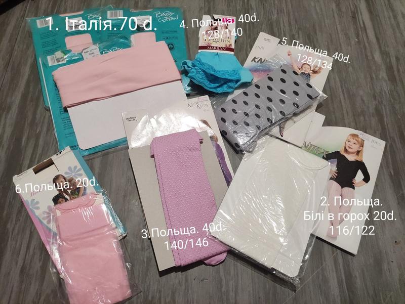 Колготки Knitexx, микрофибра, производитель Польша, Италия, 1. Капронки розовые. Производитель Италия. 70 den. На размеры 5/7 лет, 7/9 лет. 2. Белые в горох. 20 den. Производитель Польша. На размер 116/122. 4. Капроновые леггинсы. 40 den. Производитель Польша. Размер 128/140. 5. Капронки серые в черный горох. Производитель Польша. Размер 128/134. 6. Капроновые гольфы. Узор сердечко. Производитель Польша. Размер 18-12. На 5-8 лет. 7. 40/152, синие 128/140 и 140/152. Салатные гольфы с сердечками на 6-10 лет.