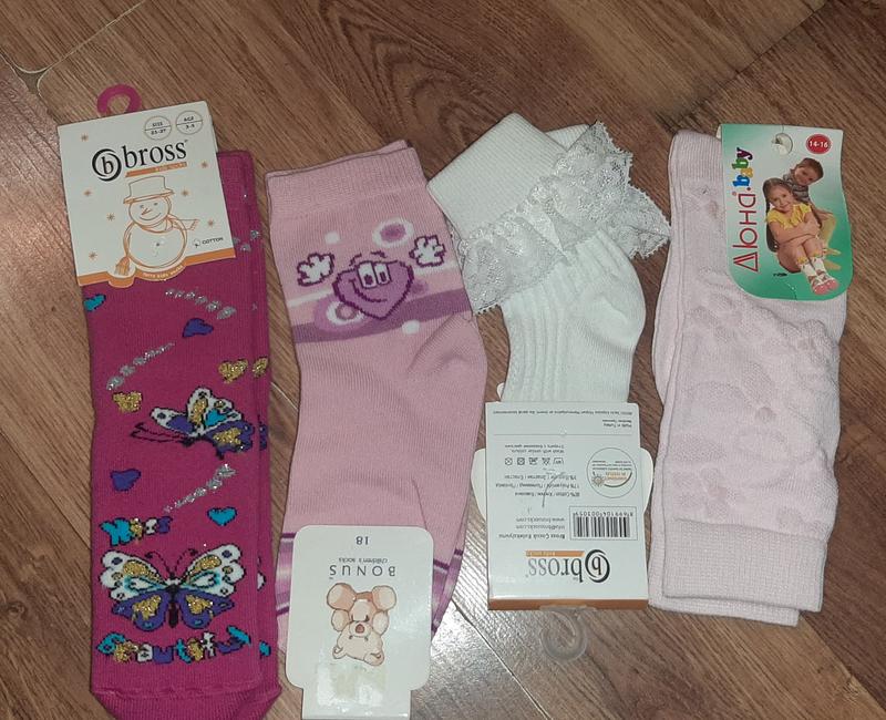 1.Шкарпетки розовые с бабочками Bross теплые, махровые 3-5 лет. Цена 60 Грн. 2.Розовые носки Bonus 18 размер(4-5 лет). Цена 40 Грн. 3.Белые носки Bross 3-5 лет. Цена 60 Грн. 4.Светло-розовые подколенники Дюна 14-16 р.(3-4 года). Цена 50 Грн.