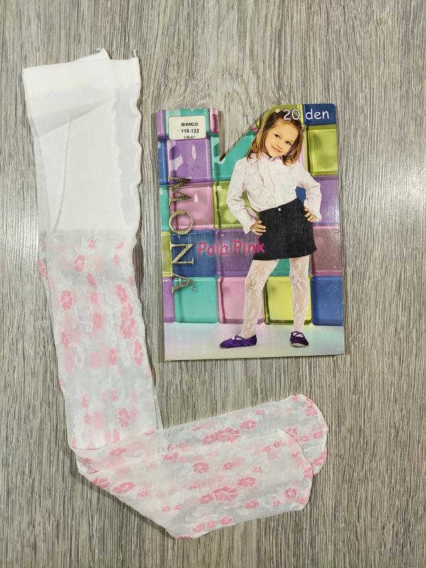 Детские безразмерные колготы. Белый цвет с розовым рисунком. 20 DEN Размер: рост 128-134 см, бедра 70 см; 1 шт рост 140-146 см, бедра 74 см; 1 шт Очень красиво смотрятся на ребенке. Производитель Польша. Цена 80 грн.