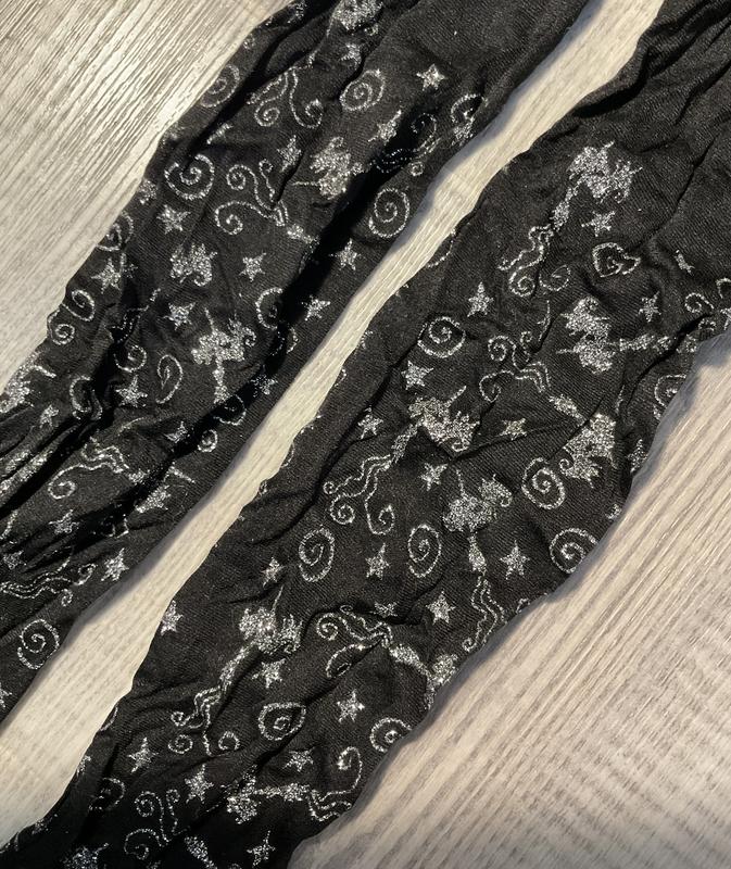 Праздничные колготы на Хэллоуин для маленьких модниц. Черный цвет и серебристый узор ведьмочек со звездочками. Колготы были одеты один раз в праздник 🎃 Ориентировочный размер детских колгот с длиной 80 см: ✅ Размер 116-122 (около возраста 5-7 лет) ✅ Материал: капрон 📍 Доставка по почте. 📩 Пишите в сообщение – ответьте на все вопросы!