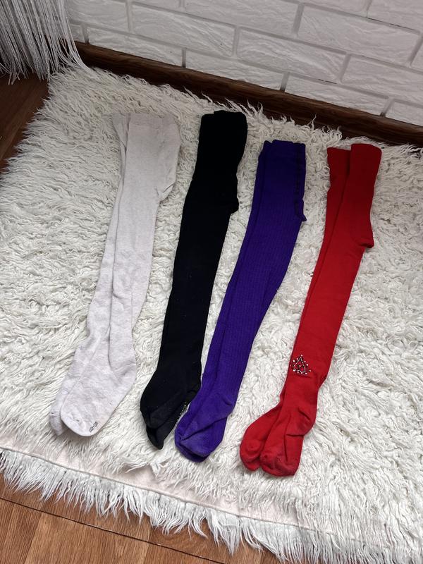 Всі колготи в гарному стані. Червоні як нові, на чорних є трохи ковтунців, а білі зашиті на нозі (на фото видно). В зоні колін колготки не витягнуті, в поясі еластичність також не втрачена. Довжина/стопа білі 66, 14 чорні 68, 15 фіолетові 66, 15 червоні 69, 16 Продаж лише лотом, ціна лоту 160грн. В оголошенні вказана приблизна ціна за 1шт