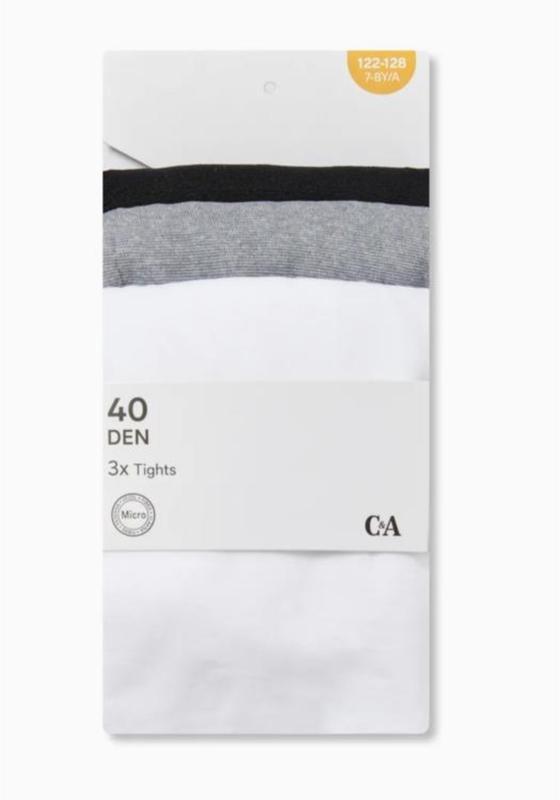 Еластичні колготки бренду С&A. В наявності розмір 122-128 Тканина – 92% поліамід, 8% еластан. Колір – білий, сірий, чорний.