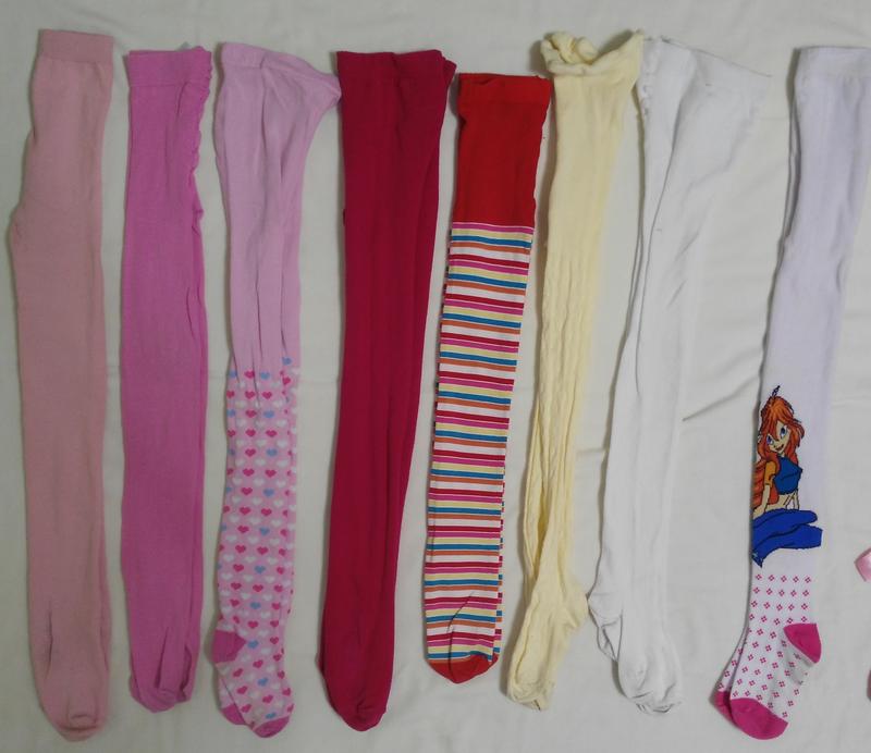Слева на право: 1. Розовые Primark указан р.11-12 лет реально на 8лет- длина 80см попа растянуто и подшито, носочки чуть припачканы. Цена 10 гр. 2.Розовые H&M р.122-128 -длина 75см. Цена 30гр 3. Розовые в сердечка kids avenue р.9-10лет маломерят. длина - 77см. Цена 30гр. 4. Малиновые Primark 9-10лет маломерят длина 75см. Цена 30гр 5. Красные в полоску нет этикетки это Польша качество отменное. Длина -70см, но они очень хорошо тянутся. Состояние идеальное. Цена 70гр. 6. Желтые длина 77см, они на 6-7лет отлично. Цена 20гр. 7.Белые колготки длина 75см. Цена 40гр 8. Белые новые. Длина 77см. Цена 40гр