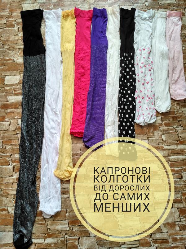 зліва - направо 1, білі капронові - довжина 93см 2, жовті тонкі капронки - довжина 76см 3, малинові лосінки - довжина 70см 4, білі з візерунком капронові колготи - довжина 53см 5, чорні з черепами - довжина 70см 6, білі з рожевими сердечками - довжина 53см 7, білі капронки-довжина 47см 8, світло-розові капронки 3-12 міс oshkosh - довжина 44см-продано стан у всіх гарний, як деякі нові, без затяжок