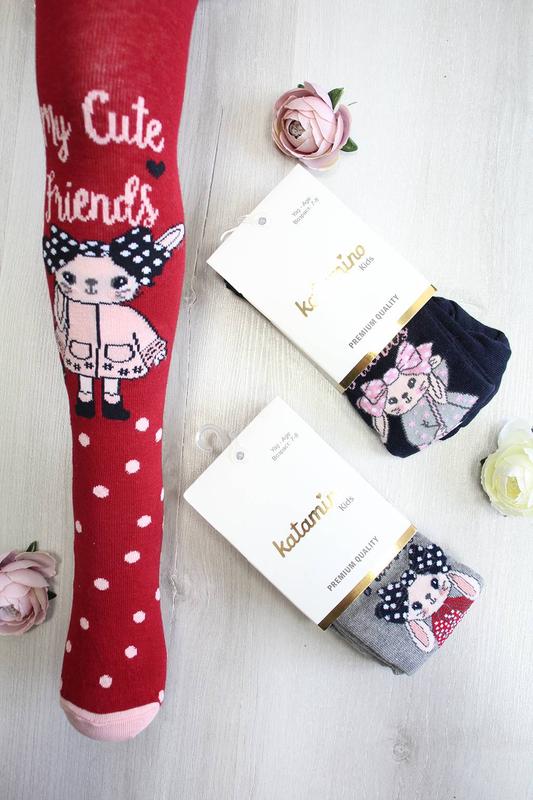 Колготки из натуральной ткани. Имеют плоские швы, а также уплотненные пальчики и пяточки. Украшены девочкой-кроликом в пальтишке и ботиночках. На голове у нее большой бант. Дополнительный декор - надпись "My cute friends" над рисунком и принт из горошин под ним. Цена указана за одно изделие. Наличие расцветок уточняйте у менеджера.