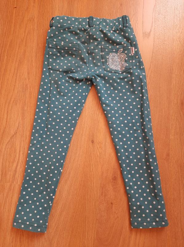 Лосины из плотного трикотажа. Цвет бирюзовый в белый горох. Ткань хорошо тянется. Сзади карманы+аппликация из камней.Дыр, пятен, затяжек и прочих дефектов нет. Длина 62см, шаговый шов 45см, в поясе 26см в нерастянутом виде,больше подайдёт на худенького ребёнка.Цена 90грн