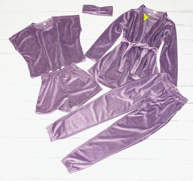 Супер комплект 5 в 1🔥 Ідеальний подарунок на будь-яке свято😍 Велюр, м'якесенький, дуже приємний на дотик! Халат + штани + футболка + шорти + пов'язка🔥 Розміри: 128-134-140 см