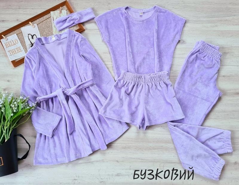 ВІДПРАВКА 23-25.01 Мега новинка Комплект 5в1 Тканина королівський велюр В комплект входять: -футболка-топ, -шорти -штани під РЕЗИНКУ -халат з поясом -пов'язка ЯКІСТЬ СУПЕР! ПОВНОМІРНІ!!! 134(2 шт)-довжина халата 61,рукав 47,пог 41,довжина футболки 40,пог 42,довжина штанів 80,крок 60,пояс 25,довжина шортів 26,пояс 25 140(2 шт)-довжина халата 63,рукав 48,пог 43,довжина футболки 42,пог 43,довжина штанів 86,крок 65,пояс 26,довжина шортів 27,пояс 26 146(1 шт)-довжина халата 69,рукав 50,пог 44,довжина футболки 46,пог 45,довжина штанів 92,крок 70,пояс 27,довжина шортів 28,пояс 27 152(2 шт)-довжина халата 72,рукав 52,пог 48,довжина футболки 47,пог 47,довжина штанів 98,крок 73,пояс 28,довжина шортів 30,пояс 28 158(2 шт)-довжина халата 75,рукав 57,пог 50,довжина футболки 49,пог 48,довжина штанів 102,крок 78,пояс 29,довжина шортів 32,пояс 29 164(2 шт)-довжина халата 77,рукав 60,пог 51,довжина футболки 51,пог 50,довжина штанів 105,крок 82,пояс 30,довжина шортів 33,пояс 30 +-2 см