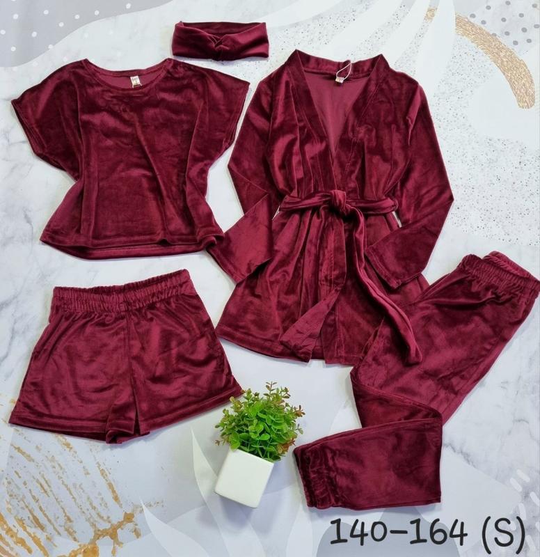 Мега новинка Комплект 5в1 Тканина королівський велюр В комплект входять: -футболка-топ, -шорти -штани під РЕЗИНКУ -халат з поясом -пов'язка ЯКІСТЬ СУПЕР! ПОВНОМІРНІ!!! 140(3 шт)-довжина халата 63,рукав 48,пог 43,довжина футболки 42,пог 43,довжина штанів 86,крок 65,пояс 26,довжина шортів 27,пояс 26 146(2 шт)-довжина халата 69,рукав 50,пог 44,довжина футболки 46,пог 45,довжина штанів 92,крок 70,пояс 27,довжина шортів 28,пояс 27 152(3 шт)-довжина халата 72,рукав 52,пог 48,довжина футболки 47,пог 47,довжина штанів 98,крок 73,пояс 28,довжина шортів 30,пояс 28 158(5 шт)-довжина халата 75,рукав 57,пог 50,довжина футболки 49,пог 48,довжина штанів 102,крок 78,пояс 29,довжина шортів 32,пояс 29 164(4 шт)-довжина халата 77,рукав 60,пог 51,довжина футболки 51,пог 50,довжина штанів 105,крок 82,пояс 30,довжина шортів 33,пояс 30 170(S)-(5 шт)-довжина халата 79,рукав 63,пог 53,довжина футболки 52,пог 53,довжина штанів 107,крок 84,пояс 31,довжина шортів 34,пояс 31 +-2 см