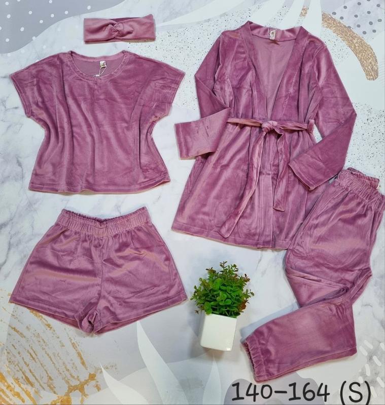 Мега новинка Комплект 5в1 Ткань королевский велюр В комплект входять: -футболка-топ, -шорти -брюки под РЕЗИНКУ -халат с поясом -повязка КАЧЕСТВО СУПЕР! ПОЛНОМЕРНЫЕ!!! 140(3 шт)-длина халата 63,рукав 48, пог 43, длина футболки 42, пог 43, длина брюк 86, крок 65,пояс 26,длина шорт 27,пояс 26 146(2 шт)-длина халата 69,рукав 50, пог 44, длина футболки 46, пог 45, длина брюк 92, крок 70,пояс 27,длина шорт 28,пояс 27 152(3 шт)-длина халата 72,рукав 52, пог 48, длина футболки 47, пог 47, длина брюк 98, крок 73,пояс 28,длина шорт 30,пояс 28 158(5 шт)-длина халата 75,рукав 57, пог 50,длина футболки 49, пог 48, длина брюк 102, крок 78,пояс 29, длина шорт 32,пояс 29 164(4 шт)-длина халата 77,рукав 60, пог 51,длина футболки 51,пог 50,длина брюк 105,крок 82,пояс 30,длина шорт 33,пояс 30 170(S)-(5 шт)-длина халата 79,рукав 63,пог 53,длина футболки 52,пог 53,длина брюк 107,крок 84,пояс 31,длина шорт 34,пояс 31 +-2 см