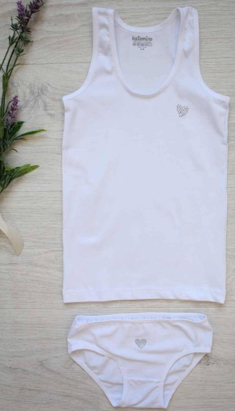 Комплект двойка из натуральной ткани белого цвета. В набор входят трусики слипы и майка на широких бретельках. Декор – аккуратная аппликация из прозрачных страз (в виде сердца). размер 7-8 роков (122-128) Стоимость 150 грн