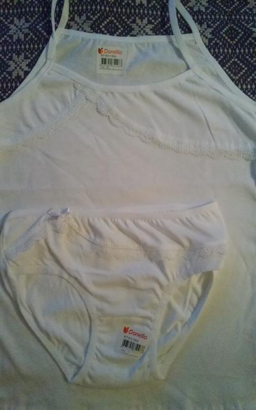 Комплект белья для девочки ТМ Донелла. Майка на тонких бретелях и трусики белого цвета с хлопковым кружеврм. Есть размеры на 8-9 лет.