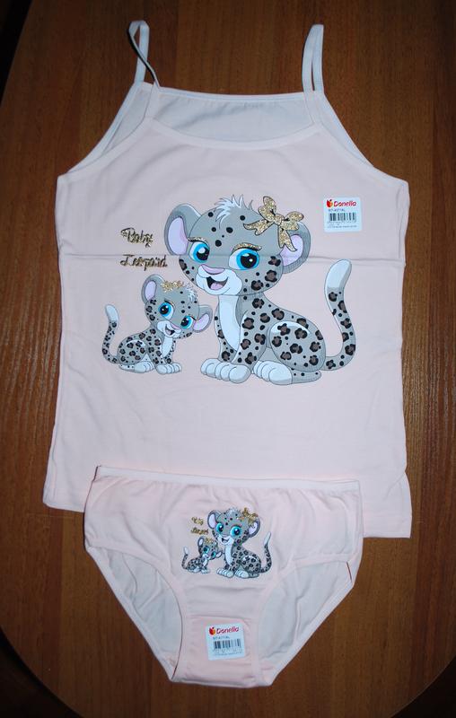 В наличии комплект производства Турции фабрика Donella по составу 95% хлопок и 5% эластан размер 6-7 рост 122-128 майка длина 45,5 см, полуобхват груди 31 см трусики резинка 23х2 см, высота 19 см