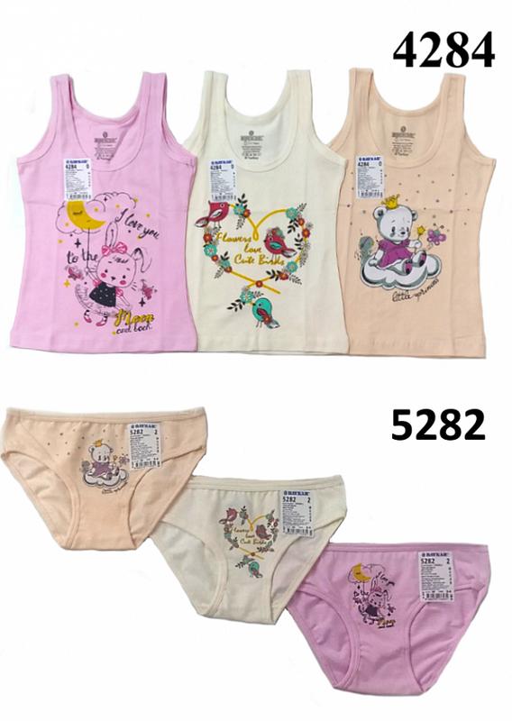 Комплект детского белья для девочки ( 0-5 ) Майка АРТ-4284 Трусы АРТ--5282 Цвет : молочный. персиковый. розовый. Состав: 95% хлопок 5% эластан Размер: 0 на рост 86-92 1 на рост 98-104 2 на рост 110-116 3 на рост 122-128 4 на рост 134-140 5 на рост 146-152 6 на рост 158-164 7 на рост 170-176