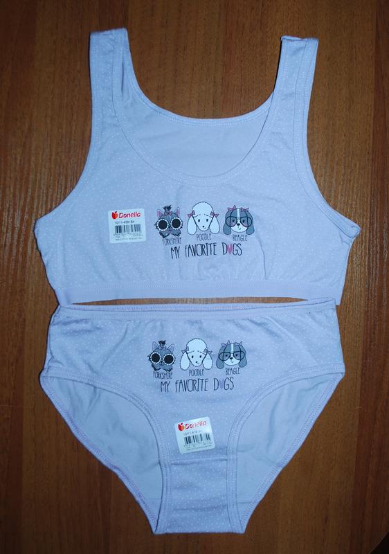 В наличии комплект производства Турции фабрика Donella по составу 95% хлопок и 5% эластан размер 10-11 рост 146-152 топ длина 24 см, полуобхват груди 30 см трусики резинка 25х2 см, высота 21 см