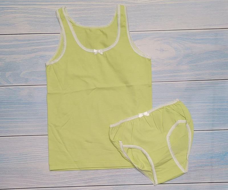 Бельеный комплект майка и трусики для девочки. Натуральная ткань, приятная на ощупь. В наличии размер: 68 (рост 104-110см) замеры: майка: ширина 26 см, длина 44 см; трусики: ширина: 24 см, длина: 19 см 60 (рост 92-98 см) замеры: майка: ширина 23 см, длина 37 см; трусики: ширина: 18 см, длина: 15 см Состав: 95% хлопок + 5% лайкра, пенье
