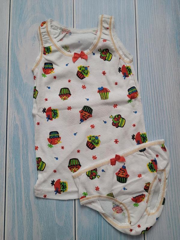 Комплект детского белья для девочки. Ткань очень мягкая, красиво тянется. Размер 60 (рост 92 -98 см) - замеры: майка ширина по линии груди 21 см, длина 36 см; трусики ширина 19 см, длина 15 см.