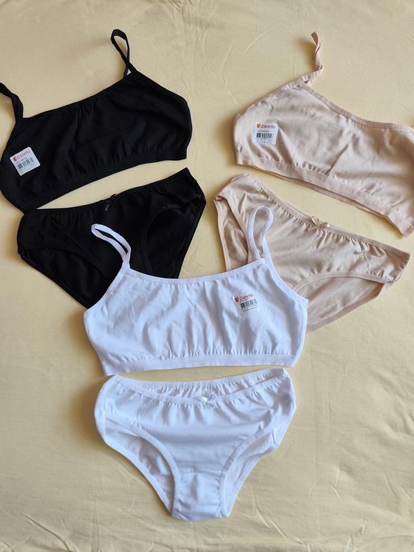 Хлопковые комплекты для девушек ТМ Donella. Топ и трусики. Можно отдельно. В наличии: 8/9 - белый, черный 10/11 - белый, бежевый, черный и серый. 12/13, 14/15 - белый, бежевый, черный. Также в наличии есть другие модели и цвета.