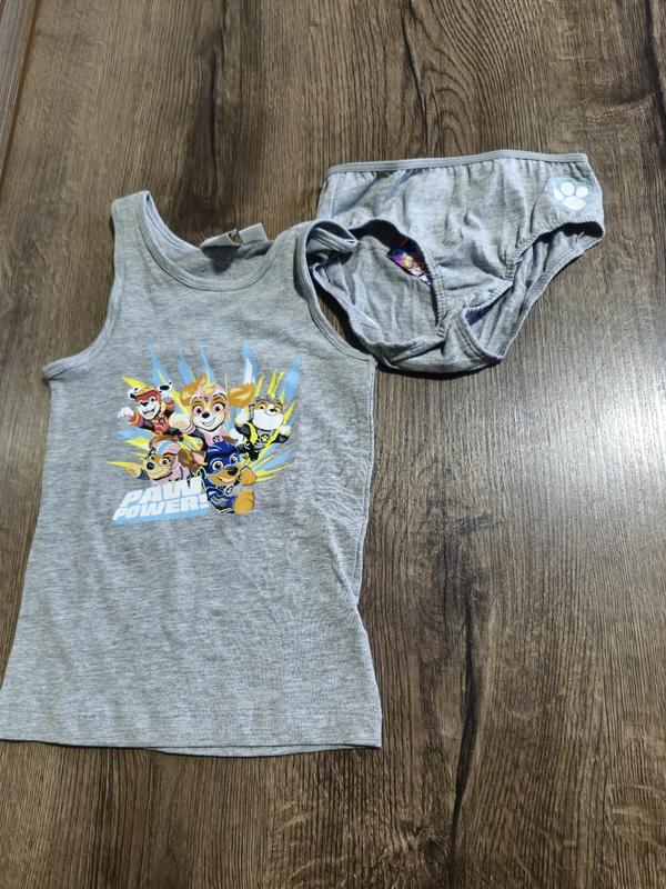 Комплект для девочки. Состоит из майки и трусиков. Размер 98/104. 85% хлопок, 10% вискоза,5% эластан. Длина майки 41 см, по груди 25 см. Длина трусиков 17 см, по резинке 21 см