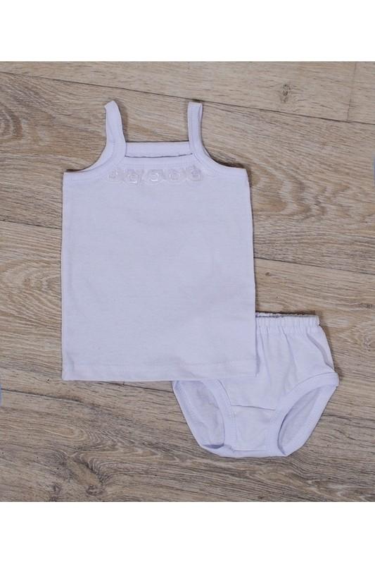 Комплект для девочек состоит из топа с кружевом и трусов. Пошит из белого кулира
