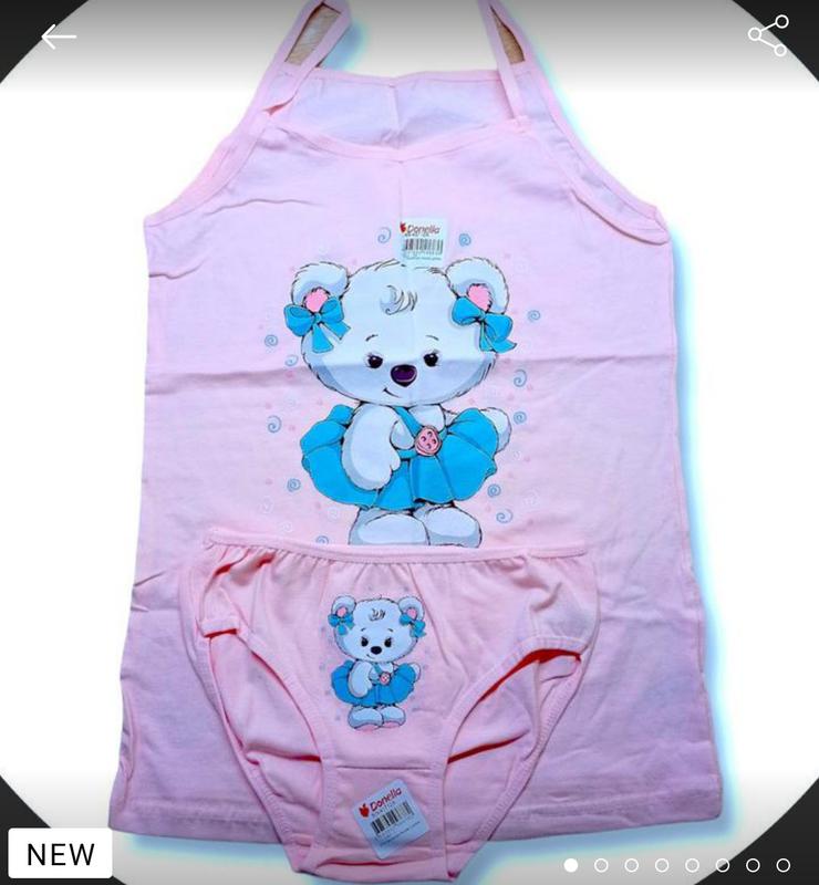 Дитяча білизна відмінної якості. Розмір за віком 8/9. Виробник DONELLA, Туреччина. Моделі відшиті з якісної органічної бавовни. Анатомічно комфортні. Дитячий комплект майка і трусики для дівчаток з малюнком. Майки на тонких та широких бретелях, трусики прикрашені попереду маленьким бантиком. Склад тканини: 95%бавовна, 5%еластан. Розміри та малюнки треба узгоджувати. Розмірну сітку відправлю в повідомленнях. Дивіться також інші мої об'яви.