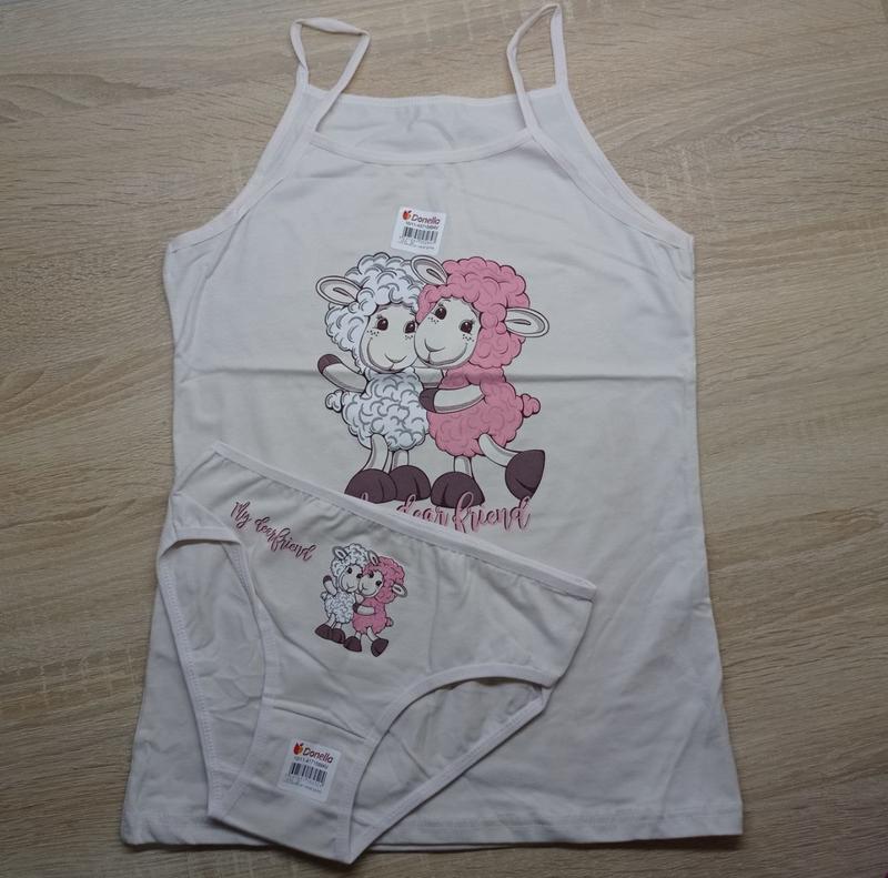 Дитяча білизна відмінної якості. Розмір за віком 10/11 . Виробник DONELLA, Туреччина. Моделі відшиті з якісної органічної бавовни. Анатомічно комфортні. Дитячий комплект майка і трусики для дівчаток з малюнком. Майки на тонких та широких бретелях, трусики прикрашені попереду маленьким бантиком. Склад тканини: 95%бавовна, 5%еластан. Розміри та малюнки треба узгоджувати. Розмірну сітку відправлю в повідомленнях. Дивіться також інші мої об'яви.