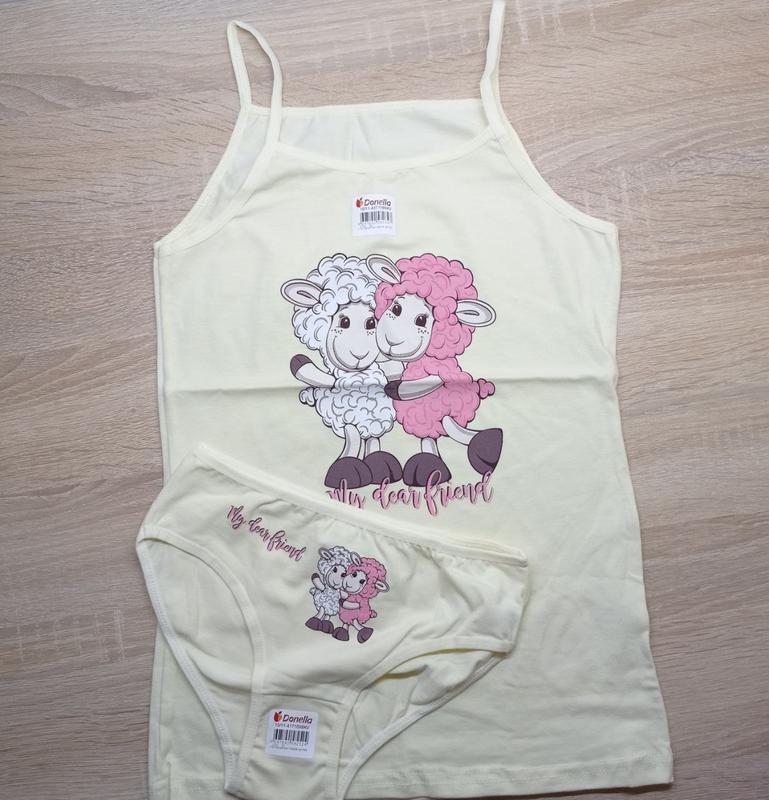 Дитяча білизна відмінної якості. Розмір за віком 10/11 . Виробник DONELLA, Туреччина. Моделі відшиті з якісної органічної бавовни. Анатомічно комфортні. Дитячий комплект майка і трусики для дівчаток з малюнком. Майки на тонких та широких бретелях, трусики прикрашені попереду маленьким бантиком. Склад тканини: 95%бавовна, 5%еластан. Розміри та малюнки треба узгоджувати. Розмірну сітку відправлю в повідомленнях. Дивіться також інші мої об'єднання яви.