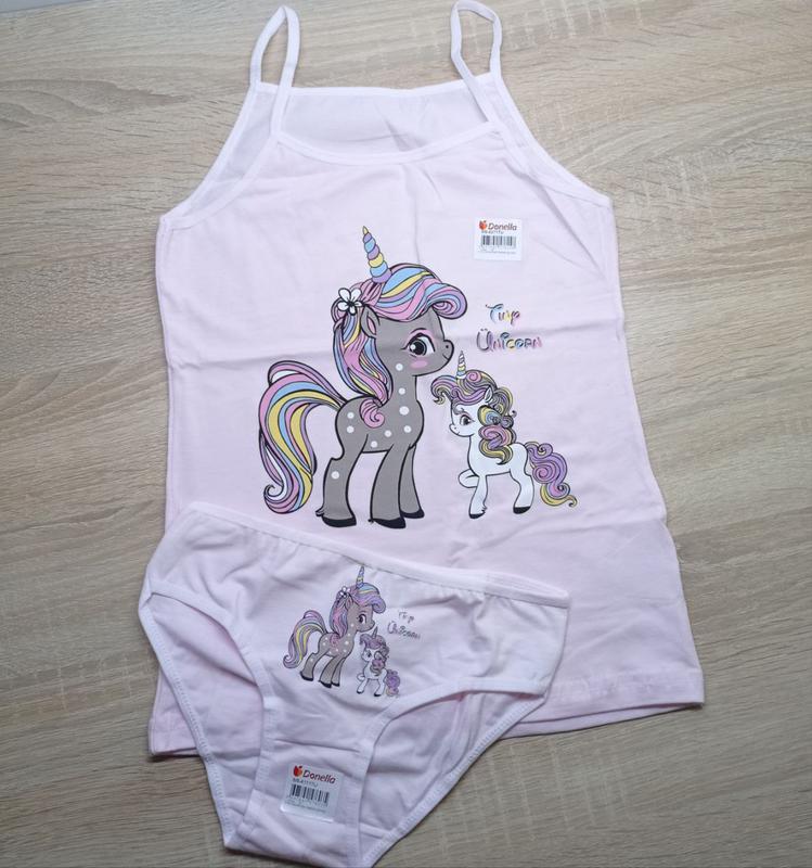 Дитяча білизна відмінної якості. Розмір за віком . Виробник DONELLA, Туреччина. Моделі відшиті з якісної органічної бавовни. Анатомічно комфортні. Дитячий комплект майка і трусики для дівчаток з малюнком. Майки на тонких та широких бретелях, трусики прикрашені попереду маленьким бантиком. Склад тканини: 95%бавовна, 5%еластан. Розміри та малюнки треба узгоджувати. Розмірну сітку відправлю в повідомленнях. Дивіться також інші мої об'яви.