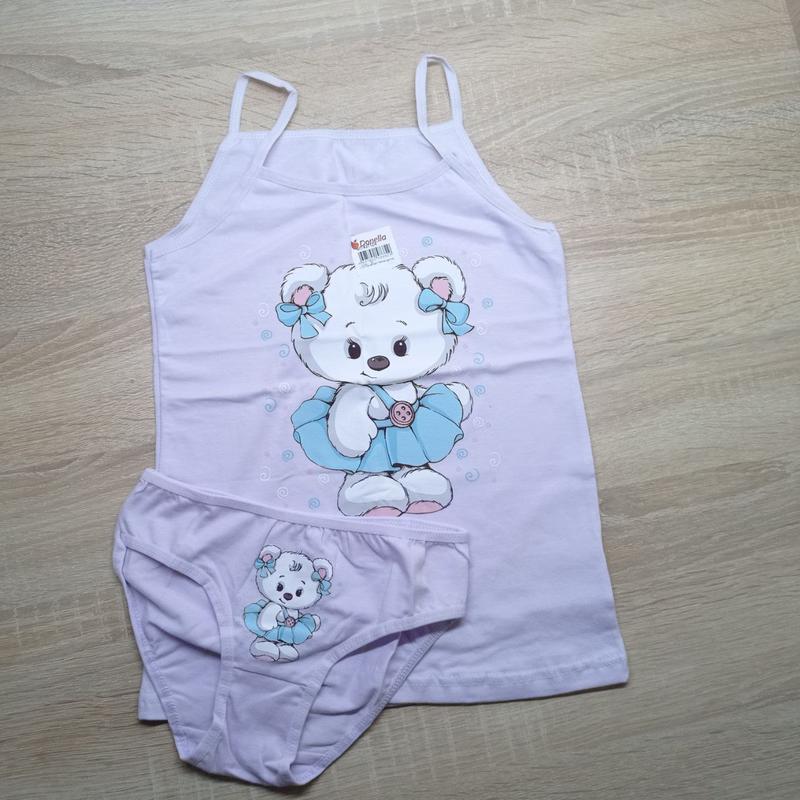 Дитяча білизна відмінної якості. Розмір за віком 6/7. Виробник DONELLA, Туреччина. Моделі відшиті з якісної органічної бавовни. Анатомічно комфортні. Дитячий комплект майка і трусики для дівчаток з малюнком. Майки на тонких та широких бретелях, трусики прикрашені попереду маленьким бантиком. Склад тканини: 95%бавовна, 5%еластан. Розміри та малюнки треба узгоджувати. Розмірну сітку відправлю в повідомленнях. Дивіться також інші мої об'єднання яви.