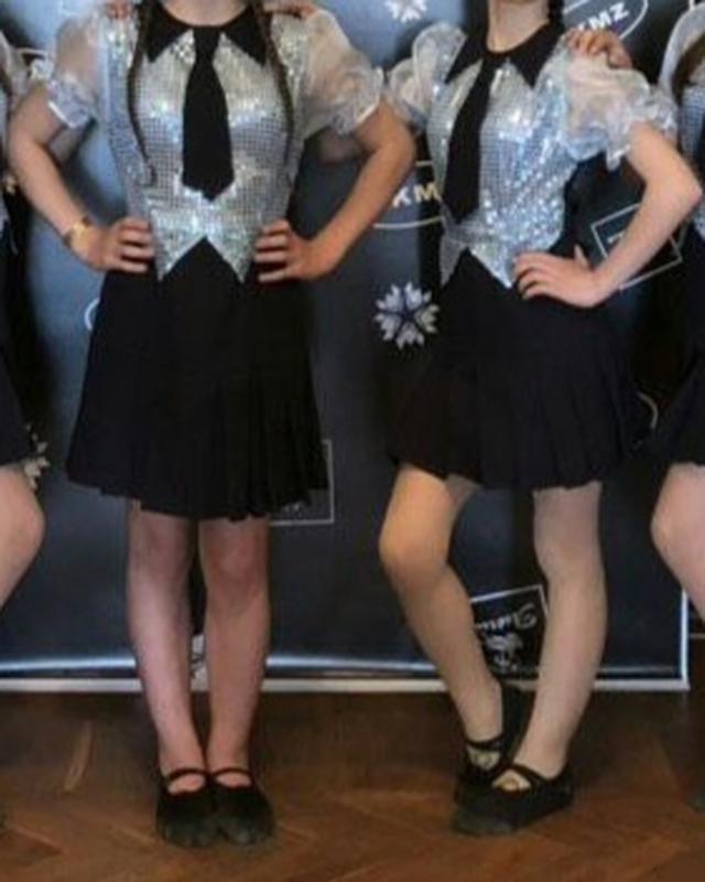 Танцевальный костюм на девочку для номера со школьной тематикой. Все части костюма сшиты вместе. То есть, костюм одевается как платье. Галстук также пришит. В комплекте с платьем - лента для волос и защитные шорты. Лента длиной 55 см. Шорты хорошо растягиваются.
