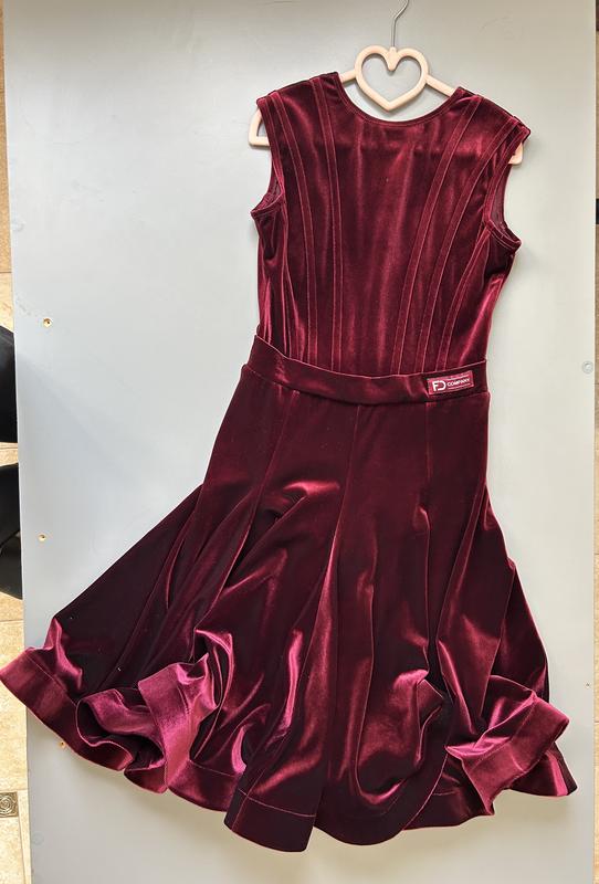 Турнірна сукня (бейсик) оксамитова, глибокого вишневого кольору на дівчинку 10-11 років на зріст 140-152см. На спині красивий виріз, защіпається на прихований замочок. Має вшиті трусики. Ідеальний стан. Одягалась всього на один турнір. Купували в магазині виробника. Розмір по етикетці 40. Склад: віскоза 70%, полістер 30%. Сукня дуже ефектна, тканина красиво переливається коли рухається. Тканина дуже добре тягнеться, тому красиво сідає по фігурі і не заважає в танці. Заміри в спокійному стані: Ширина по плечах - 32см Півобхват по грудях - 34см Півобхват по талії - 30см Довжина від плеча до талії - 34-38см(широкий пояс) Довжина спідниці - 55см
