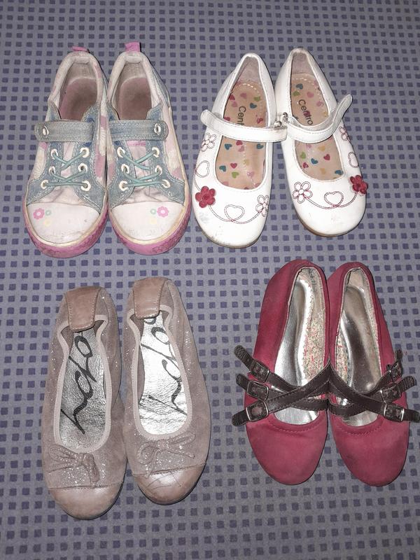 Взуття на дівчинку. 1. Біло-рожеві кросівки B&G, 28 р, 18,5см (липучки супер) - 80 грн 2. Червоні туфлі-балетки, 28р, 17,5 см устілка. - 30грн 3. Кеди Clarks "під джинс", 28½р, 18 см - 60 грн 4. Коричневі балетки, 29р, 18 см - 60 грн 5. Білі туфлі Centro, 28р, 18 см - 60 грн. Пакетом 5 пар за 130 грн, якщо Укрпоштою - оплата на карту.