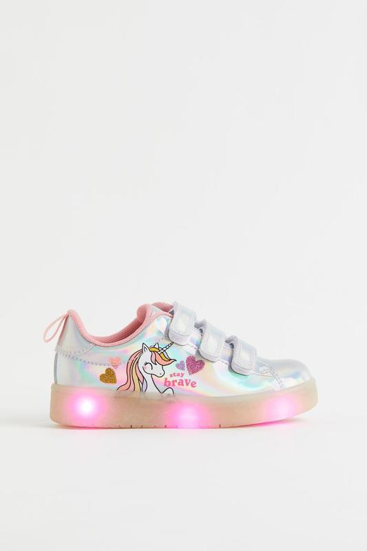 H&M Кроссовки из блестящей голографической искусственной кожи с блестящим рисунком на одной стороне, регулируемыми петлями на крючках и петлях спереди и петлей в крупный рубчик сзади. Подкладка и стелька из сетки, а также узорчатая прозрачная подошва с активируемой движением мигающей светодиодной подсветкой разных цветов. Высота подошвы 2см. 🏷️32,🏷️32___20,5см 🛍️ОТПРАВЛЯЮ 2-РАЗА В ДЕНЬ 🚀НОВАЯ и 🚜УКР 💵ПОСЛЕ ПОЛНОЙ ОПЛАТЫ 🍿ТОРГА НЕТ