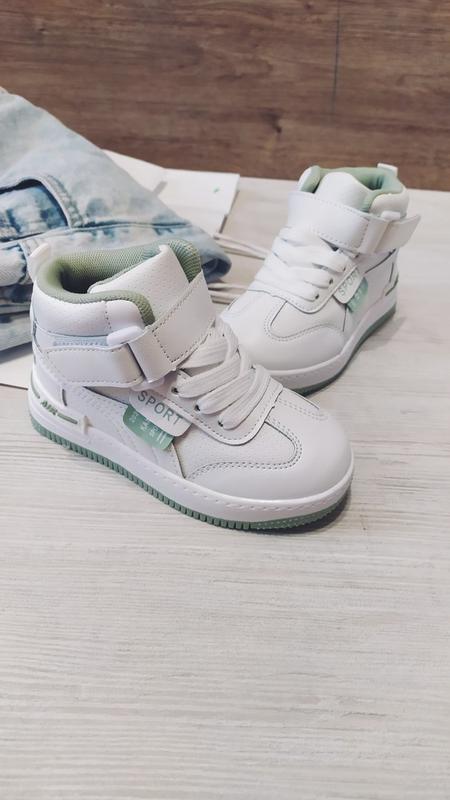 Кроссовки для девочки высокие цвет: белые с мятой. ТМ Канарейка Шнуровка и липучка Можно зафиксировать на ножке с любым подъемом Легкие Верх - эко кожа Внутри утеплены текстилем Стелька текстильная Задник твердый, хорошо фиксирует ножку Подошва гибкая Размеры: 27-16.5см 28-17.5см