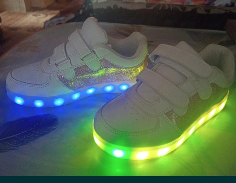 Кроссовки, оригинальные, стильные, с блестящими розовыми боками - светятся разными цветами, мигают - все режимы выбираются сбоку внутри кнопочкой. Подзаряжаются обычной зарядкой от мобильного телефона. В отличном состоянии - одевали пару раз - ножка растет быстро. 32 размер, по стельке 19 см.