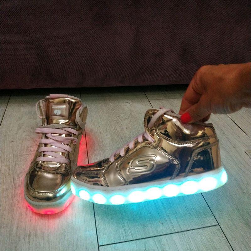 у чудовому стані. все працює, заряджається від юсб. можна регулювати світло, так само є миготливий режим. дуже класні. устілка 22-22.5 см