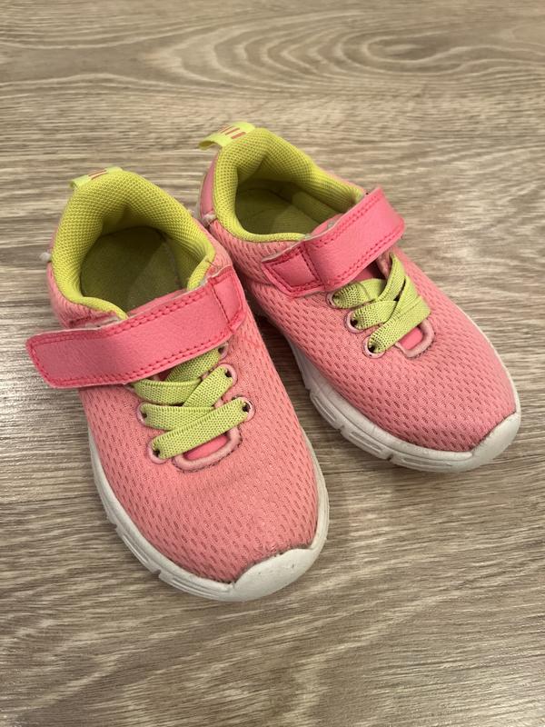 Кросівки для дівчинки, ніжно рожевого кольору з салатовими вставками. На ліпучке та шнурівка. Розмір 24, устілка 15.