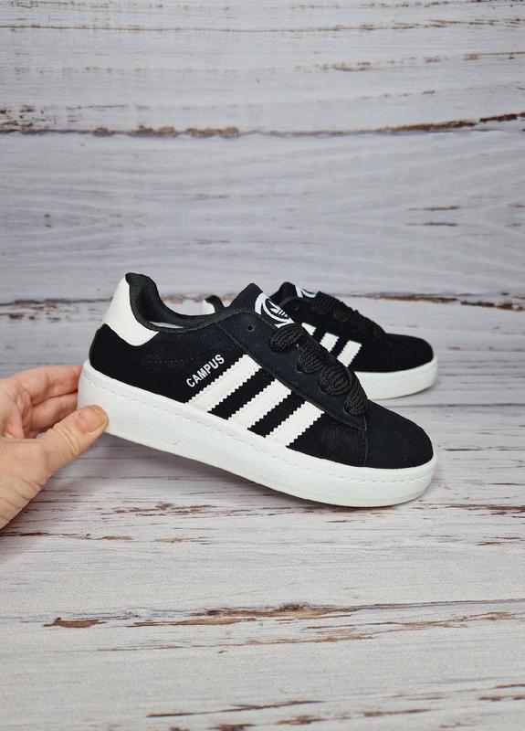 Кроссовки Adidas Campus (Кампус) Сезон: весна-лето-осень Цвет: черный Материал внешний - искусственная замша. Материал подкладки - текстиль Стелька - анатомическая текстильная стелька с супинатором Шнуровка подстраивается по ноге и надежно держит ножку. Легкие подошва гибкая. Размеры с 33 по 39 по стельке полностью: 33р. по стельке 21,5 см 34р. по стельке 22,0 см 36р. по стельке 23,5 см 37р. по стельке 24,0 см 38р. по стельке 24,5 см 39р. по стельке 25,0 см