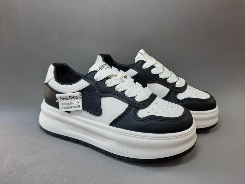 Кросівки ТМ Shosho Колір: білий/чорний Верх - еко шкіра Устілка - анатомічна Подошва: гнучка Висота підошви спереду 3 см, ззаду 3,8 см Фіксується - шнурівка Розмірна сітка: 36- 23,0 см 38- 24,0 см 39- 24,5 см 40- 25,0 см